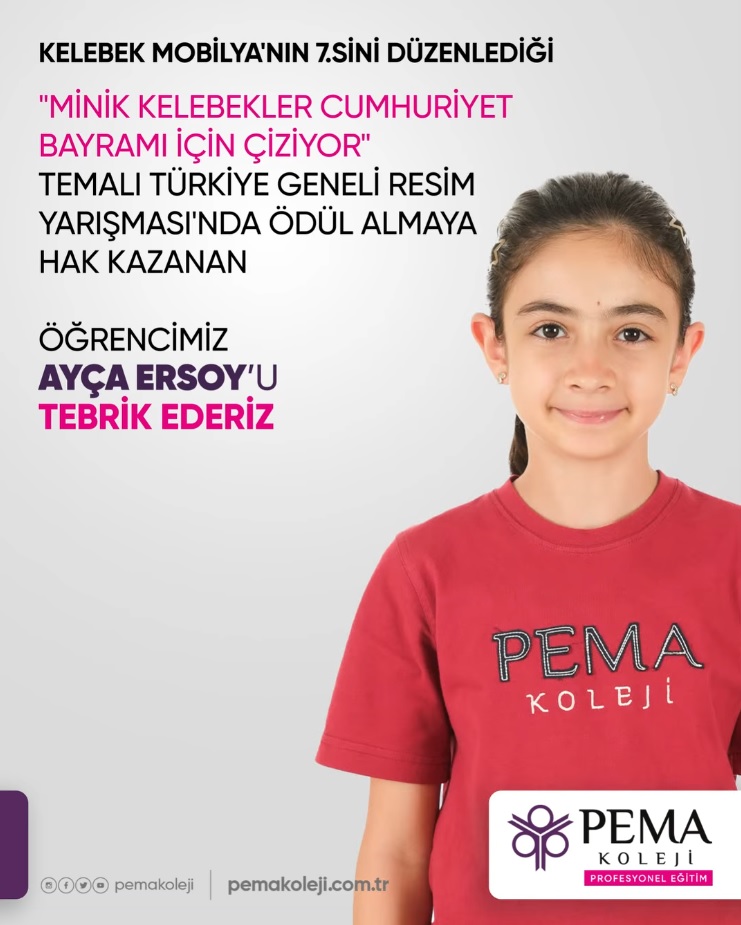 Kelebek Mobilya'nın 7.sini düzenlediği "Minik Kelebekler Cumhuriyet Bayramı İçin Çiziyor" temalı Türkiye Geneli Resim Yarışması'nda Cumhuriyet coşkusunu ve Atatürk sevgisini renklerle anlatan ve ödül almaya hak kazanan öğrencimiz Ayça Ersoy'u tebrik ederiz.